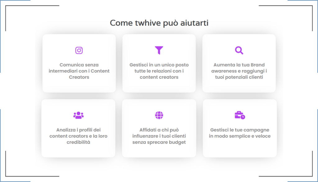 Twhive è una piattaforma collaborativa tra brand, agenzie, influencer e content creators per la gestione di campagne di comunicazione social. Un unico contenitore senza filtri e intermediazioni che consente ai professionisti del settore di instaurare un rapporto lavorativo con i brand i quali hanno a loro volta la possibilità di incrementare avviare campagne di comunicazione in modo semplice ed efficace ottimizzando costi e produttività.